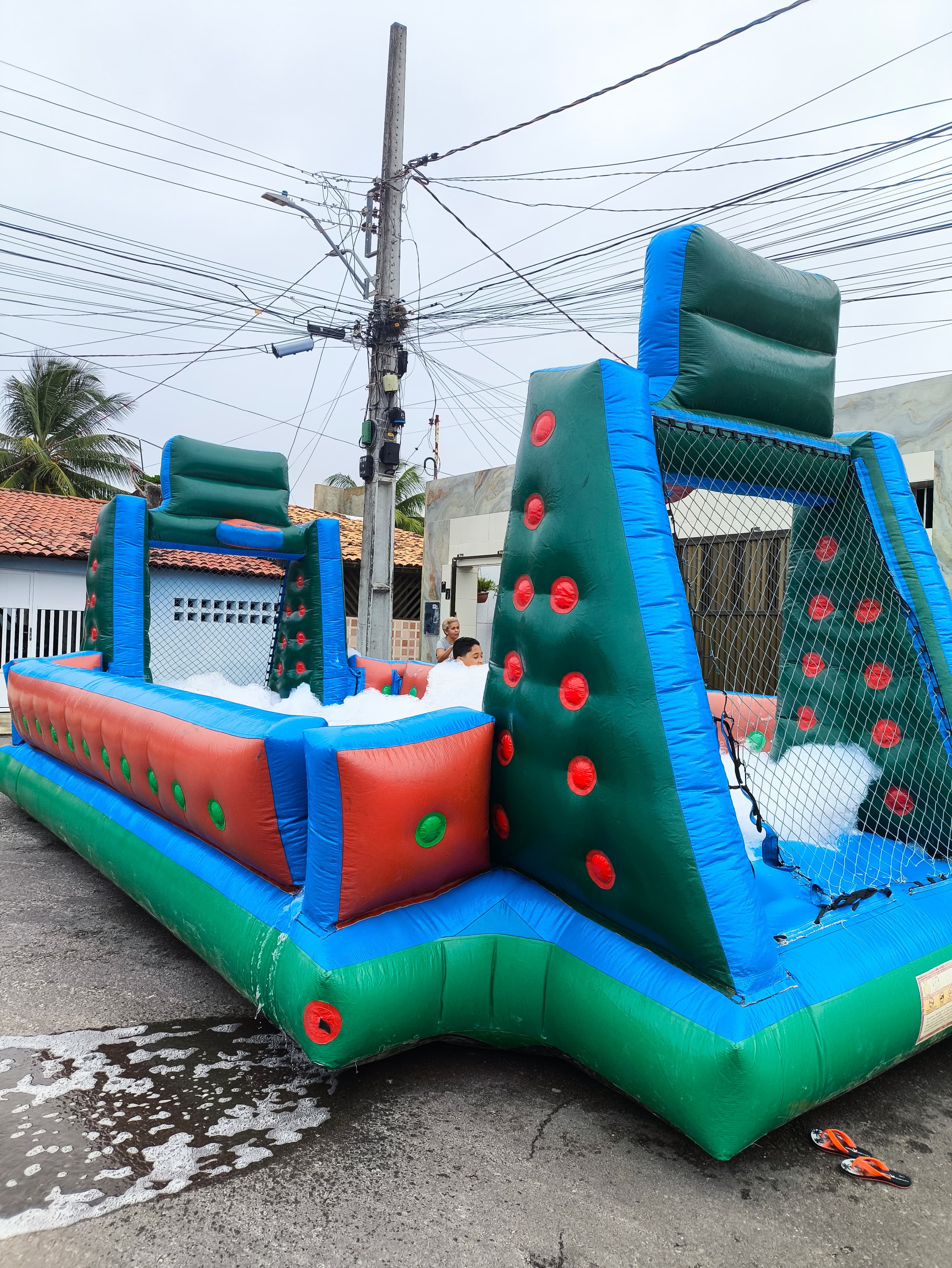 Oferecemos tobogã, cama elástica, futebol de sabão, canhão de espuma, guerra de cotonete e muito mais.